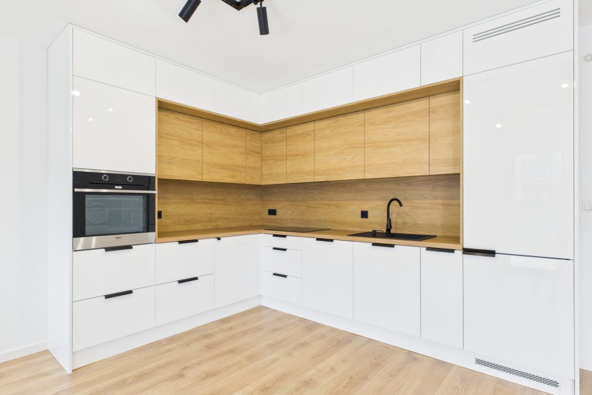 Kuchnia wyposażona jest we wszystkie niezbędne sprzęty AGD lodówkę, piekarnik, płytę indukcyjną i zmywarkę).