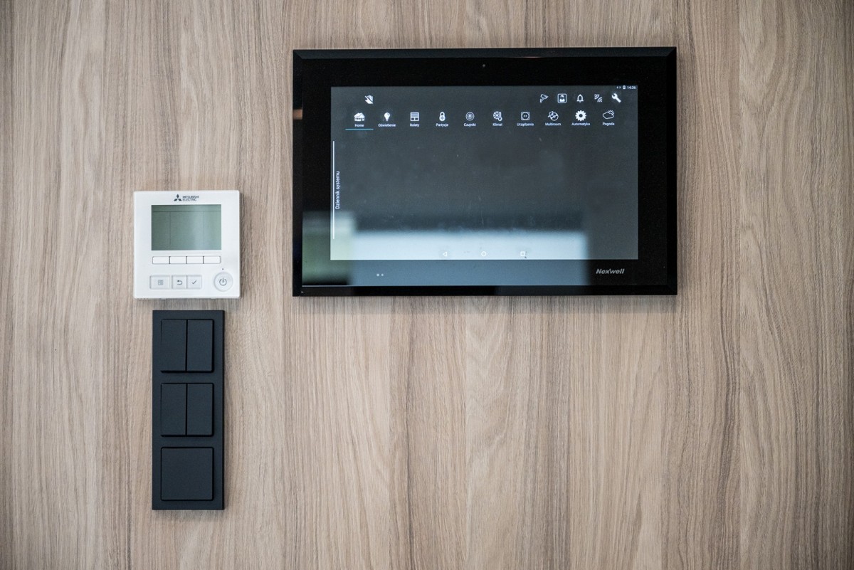 The house has two control panels (alarm system sensors, blinds, heating, lighting, intercom, and cameras)