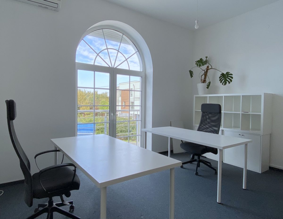 Największy pokój o powierzchni 26m2 jest klimatyzowany i wyposażony w dwa duże biurka z krzesłami oraz sofę ze stolikiem kawowym tworzącą strefę gościnną dla Klienta.