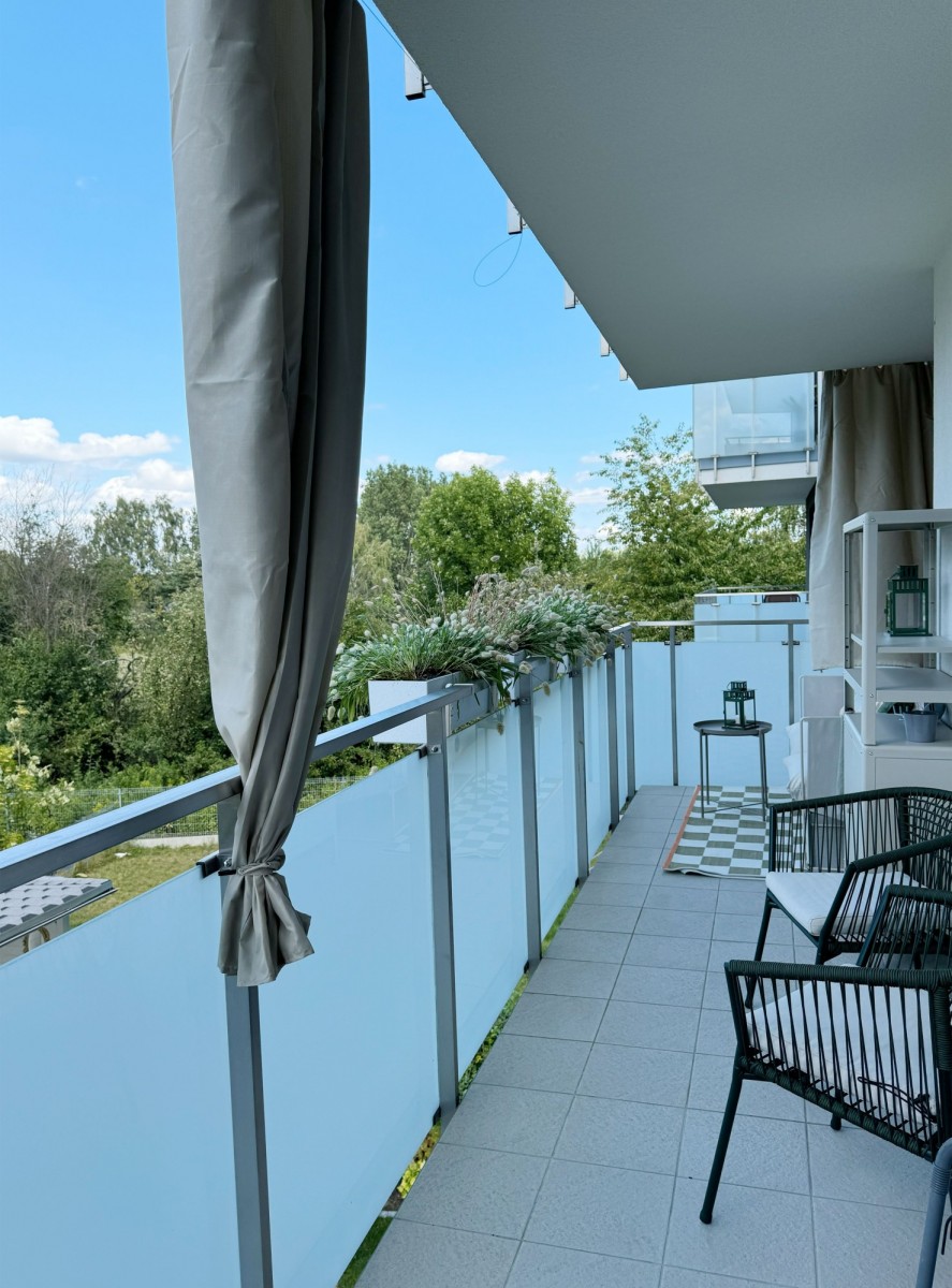 Dobrze rozplanowane i nowocześnie zaprojektowane 3 pokoje z obszerną łazienką, kuchnią otwartą na salon i wyjątkowo długim, ciągnącym się przez całe mieszkanie balkonem z widokiem na zieleń. Specjalnie do oferty dołączam zdjęcia balkonu robione latem.