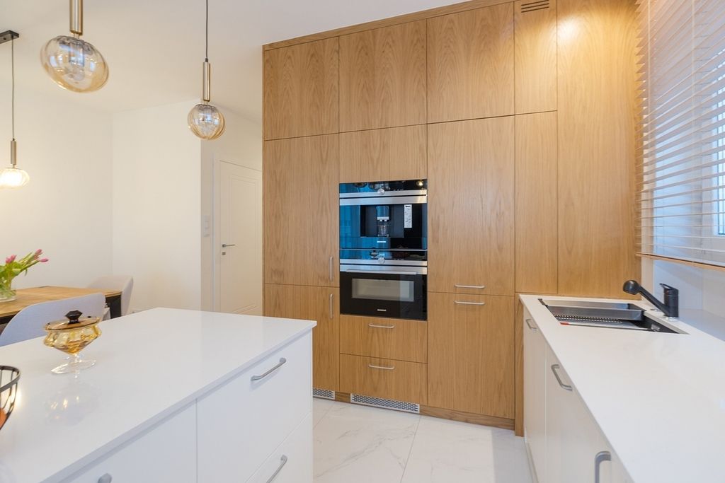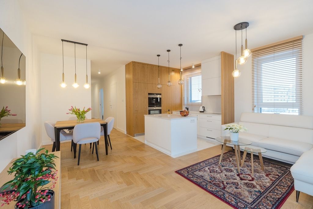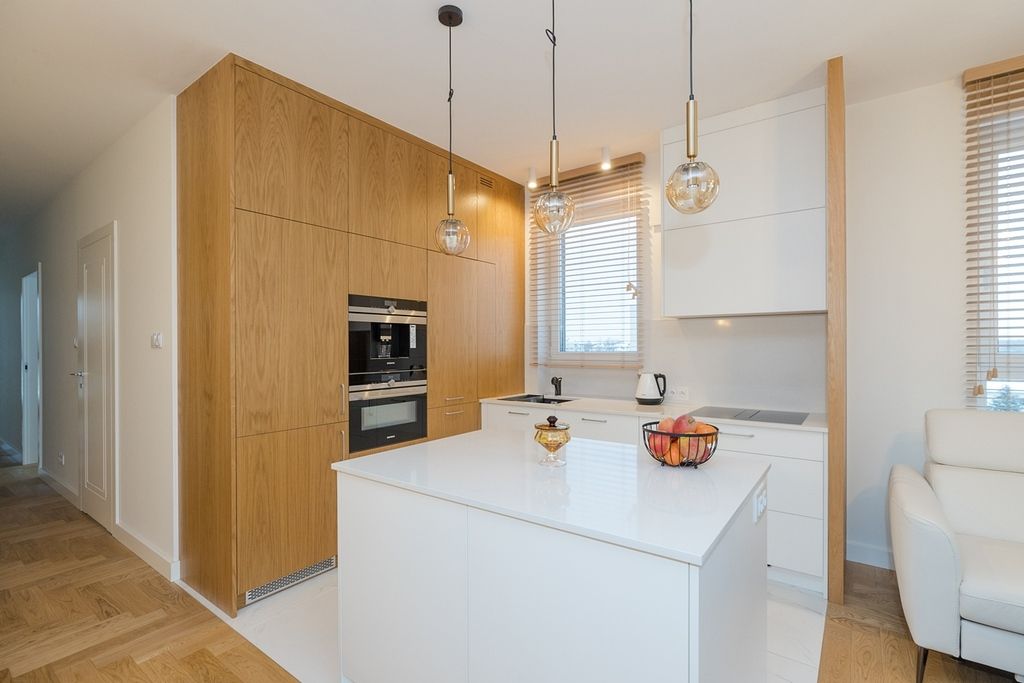 To wnętrze, które „wykończono dla siebie”, czyli bez żadnych kompromisów. Klasę materiałów widać i czuć w każdym detalu. O wysokim standardzie apartamentu świadczą m.in. klasyczny, ponadczasowy dębowy parkiet, zabudowa meblowa skrojona na miarę, kuchnia wyposażona w sprzęt marki Siemens (w tym ekspres do kawy w zabudowie oraz piekarnik z funkcją grilla i mikrofali), blaty oraz wyspa kuchenna wykonane z trwałego i eleganckiego spieku.