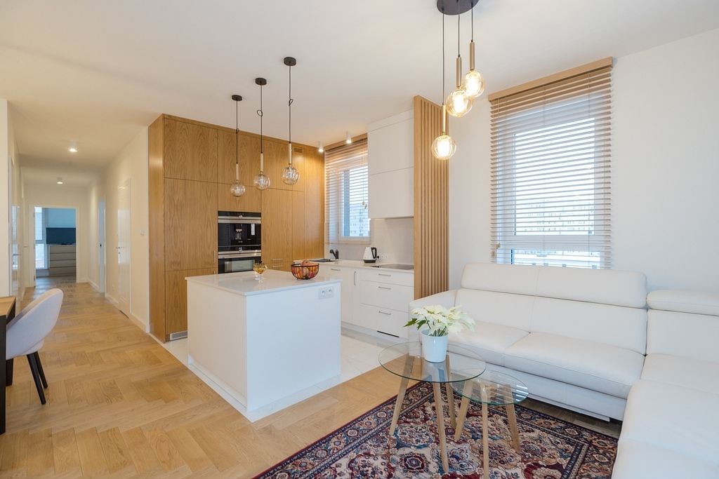 Wnętrze apartamentu to kwintesencja nowoczesnego minimalizmu. Dzięki licznym i dużym oknom oraz jasnej palecie barw, całość jest doskonale doświetlona i wydaje się jeszcze bardziej przestronna. Wykorzystane ciepłe tonacje sprawiają, że wnętrze – choć nowoczesne i przestronne – pozostaje przytulne i wyjątkowo przyjazne dla domowników.