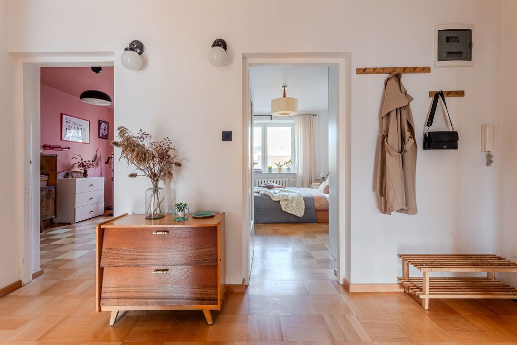 Układ mieszkania jest rozkładowy i funkcjonalny – z wyraźnym podziałem na część dzienną i prywatną. Salon połączony z kuchnią tworzy wygodną przestrzeń do codziennego życia i spotkań, natomiast dwa oddzielne pokoje mogą pełnić funkcję sypialni, pokoju dziecięcego lub gabinetu.