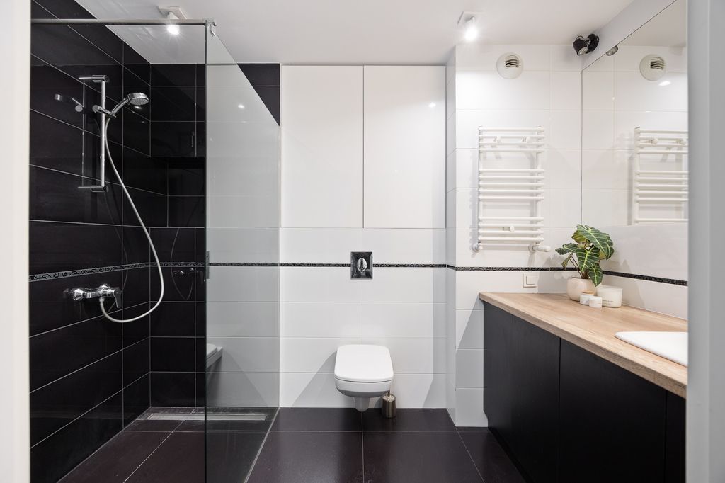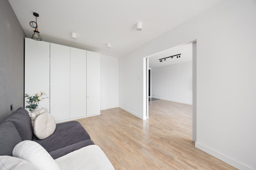 Wysoka na 2,6m nieruchomość charakteryzuje się otwartym planem z salonem i aneksem kuchennym wyposażonym w wyspę oraz charakterystyczny, czarny okap. Część dzienną od sypialni oddzielają białe, przesuwne drzwi, a podłogi wykończono panelami w kolorze naturalnego drewna i ciemnymi kaflami. Wnętrze jest jasne dzięki dużym przeszkleniom balkonowym i utrzymane w kontrastowej, czarno-białej kolorystyce.