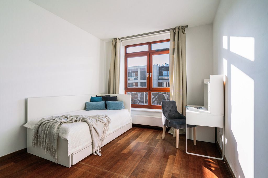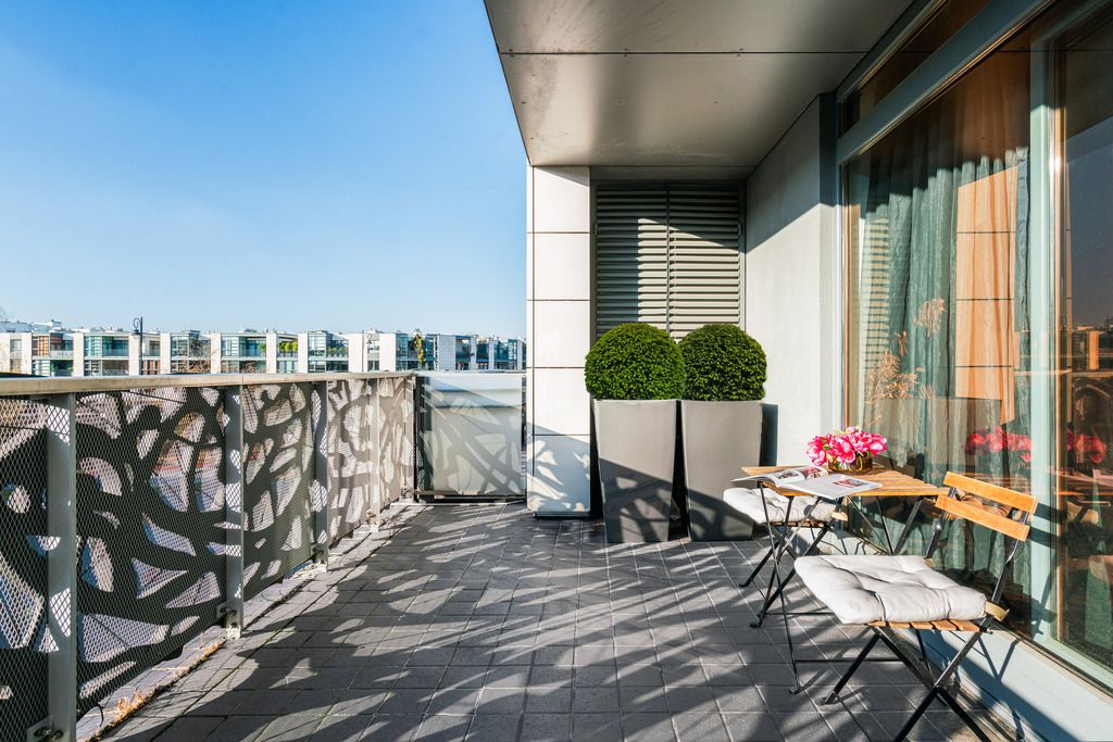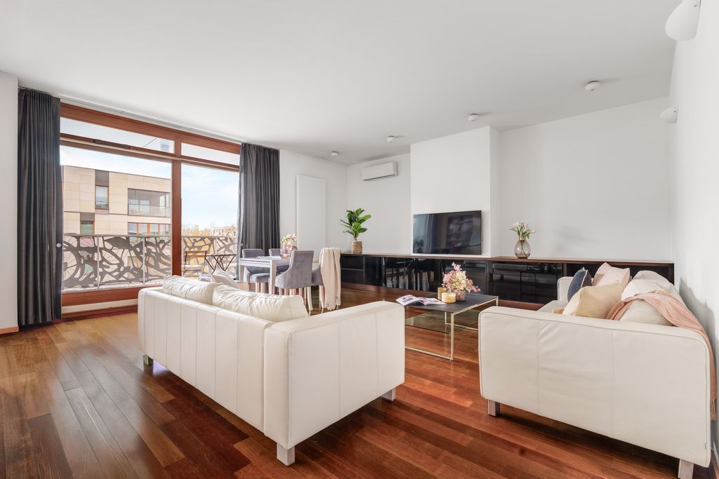The apartment is located on Franciszka Klimczaka Street, in Miasteczko Wilanów, one of the most desirable districts of Warsaw. Nearby are numerous shops, restaurants, cafes, renowned schools, preschools, as well as numerous green spaces and the Jan III Sobieski Palace.