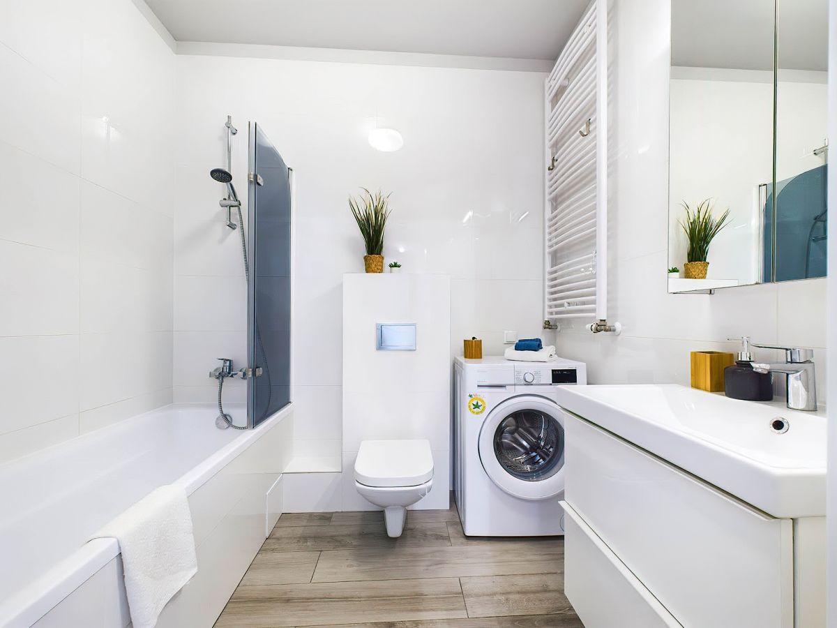 W łazience wanna z szybą umożliwiającą wygodne korzystanie z prysznica, umywalka z szufladami na kosmetyki, toaleta oraz pralka.