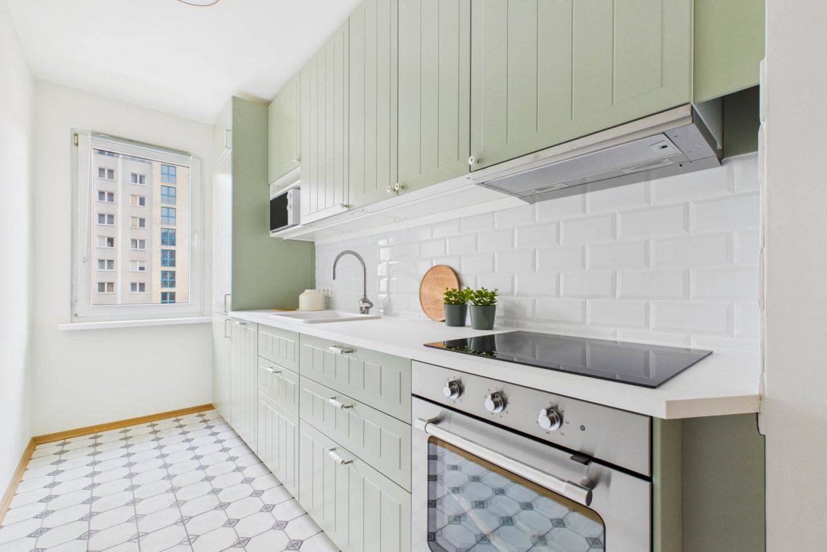 • osobna kuchnia z nową zabudową na wymiar i sprzętem AGD (zmywarka, płyta indukcyjna, lodówka w zabudowie, okap, piekarnik) oraz stolikiem śniadaniowym i dwoma hokerami.