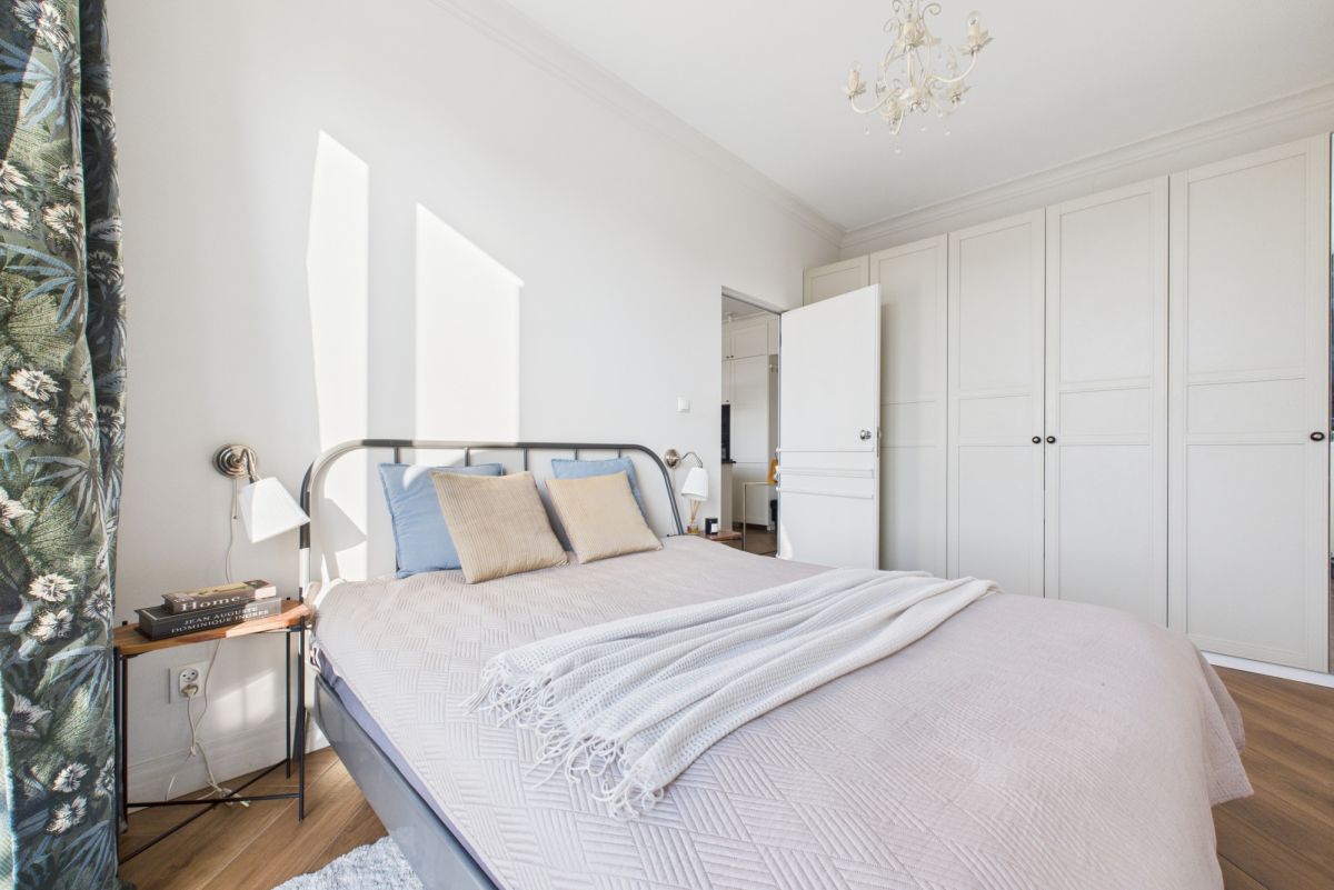 W sypialni podwójne łóżko i bardzo pojemne szafy w zabudowie.