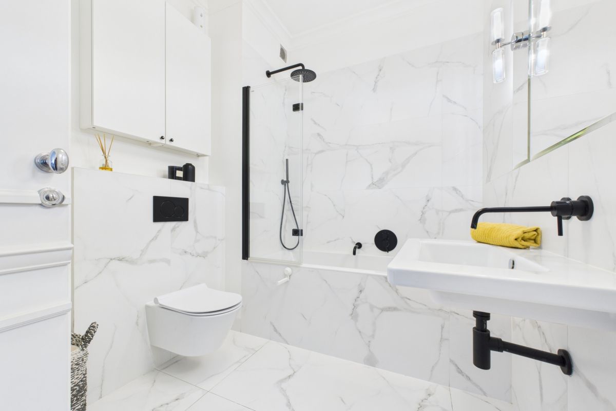 W łazience wanna z szybą i deszczownicą umożliwiającą korzystanie jak z prysznica, WC, umywalka, pralka i duża szafka na kosmetyki.