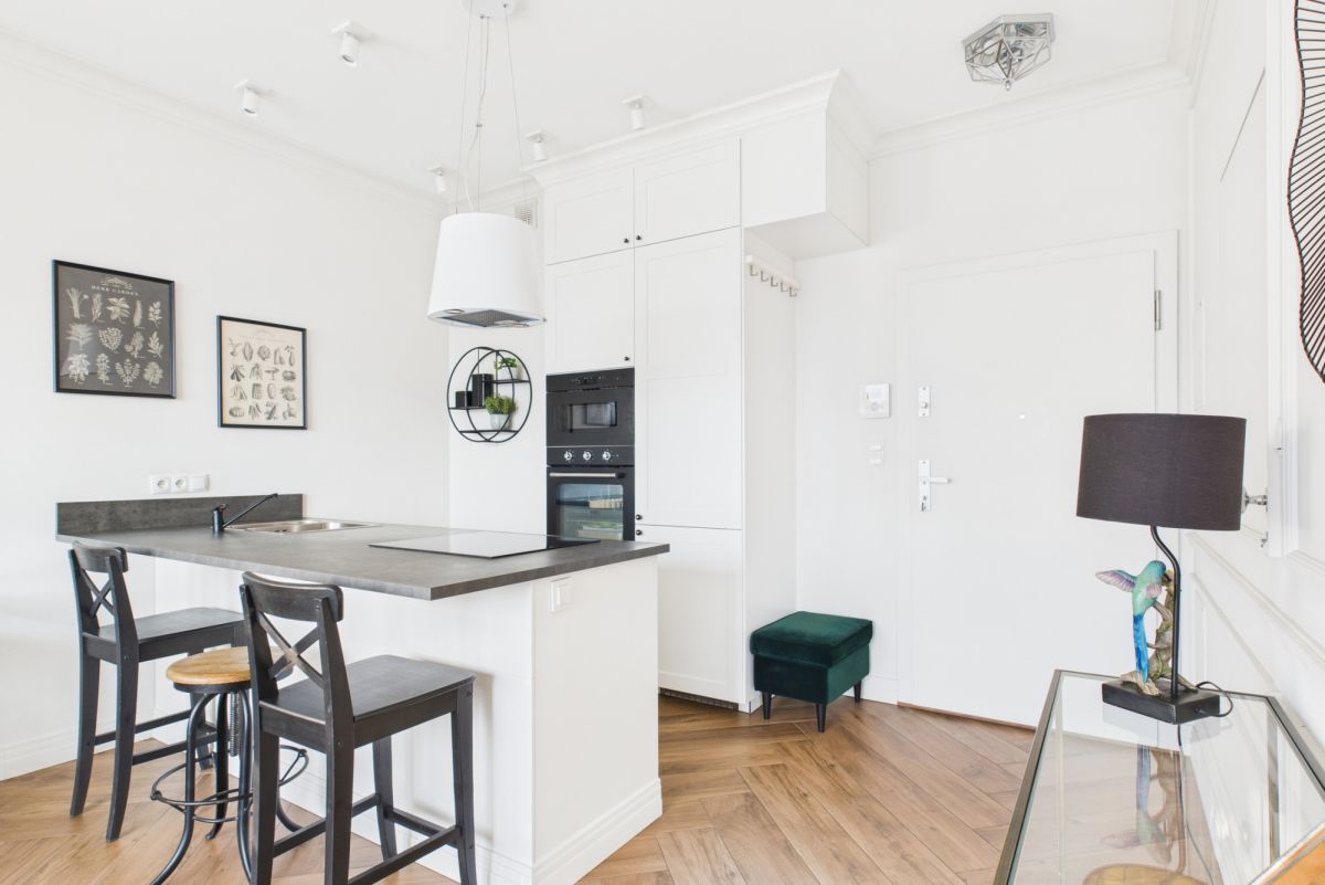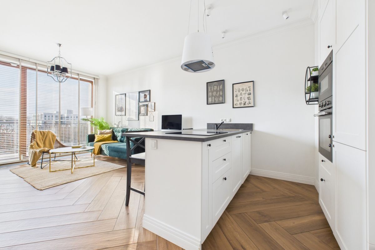 Aneks kuchenny wyposażony w zmywarkę, lodówkę z zamrażarką, piekarnik, płytę indukcyjną i kuchenkę mikrofalową.